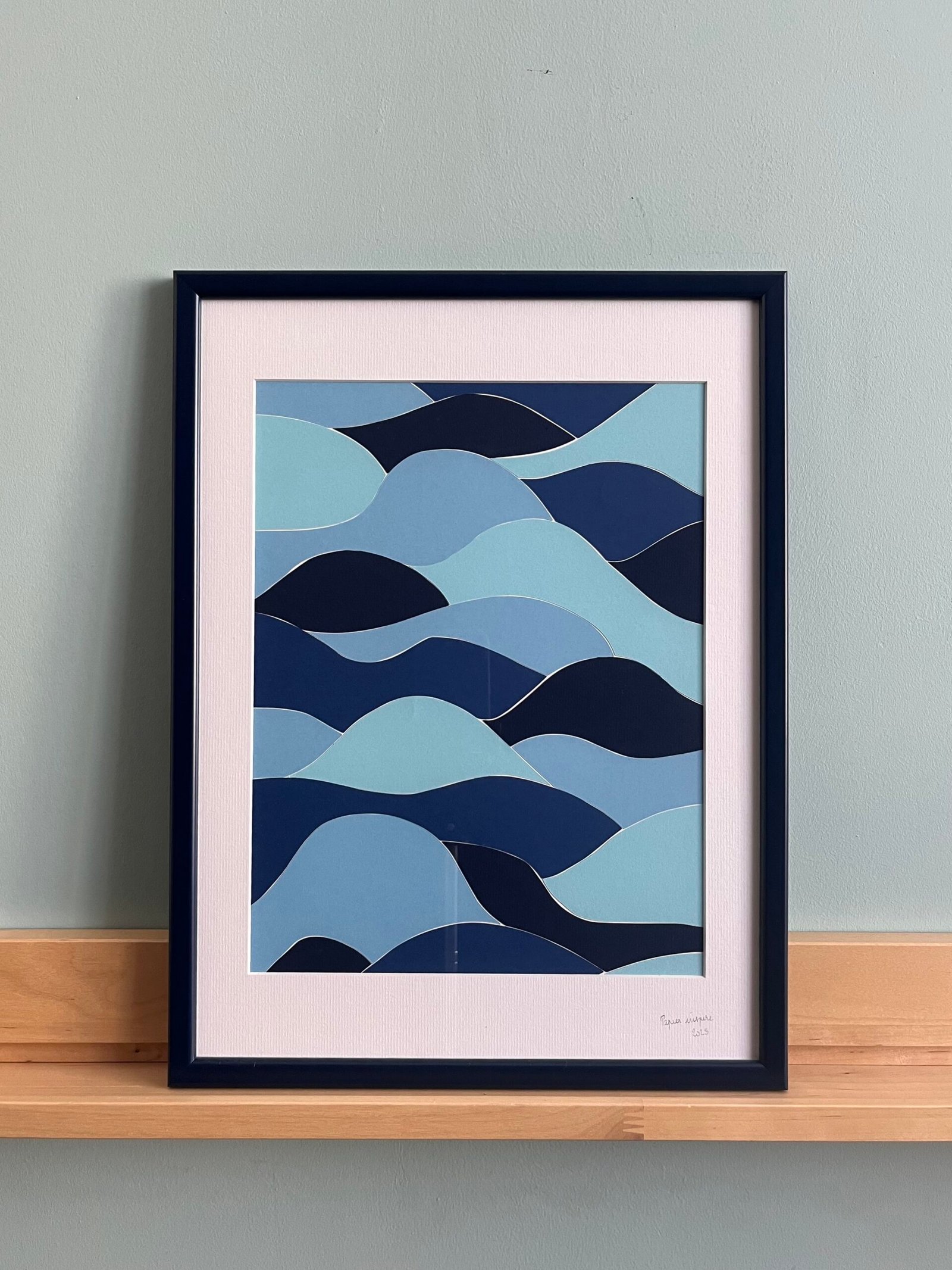 Collage réalisé à la main. Format 29x39cm, vendu encadré dans un cadre en bois, peint en bleu réalisé sur mesure avec un passe partout blanc.