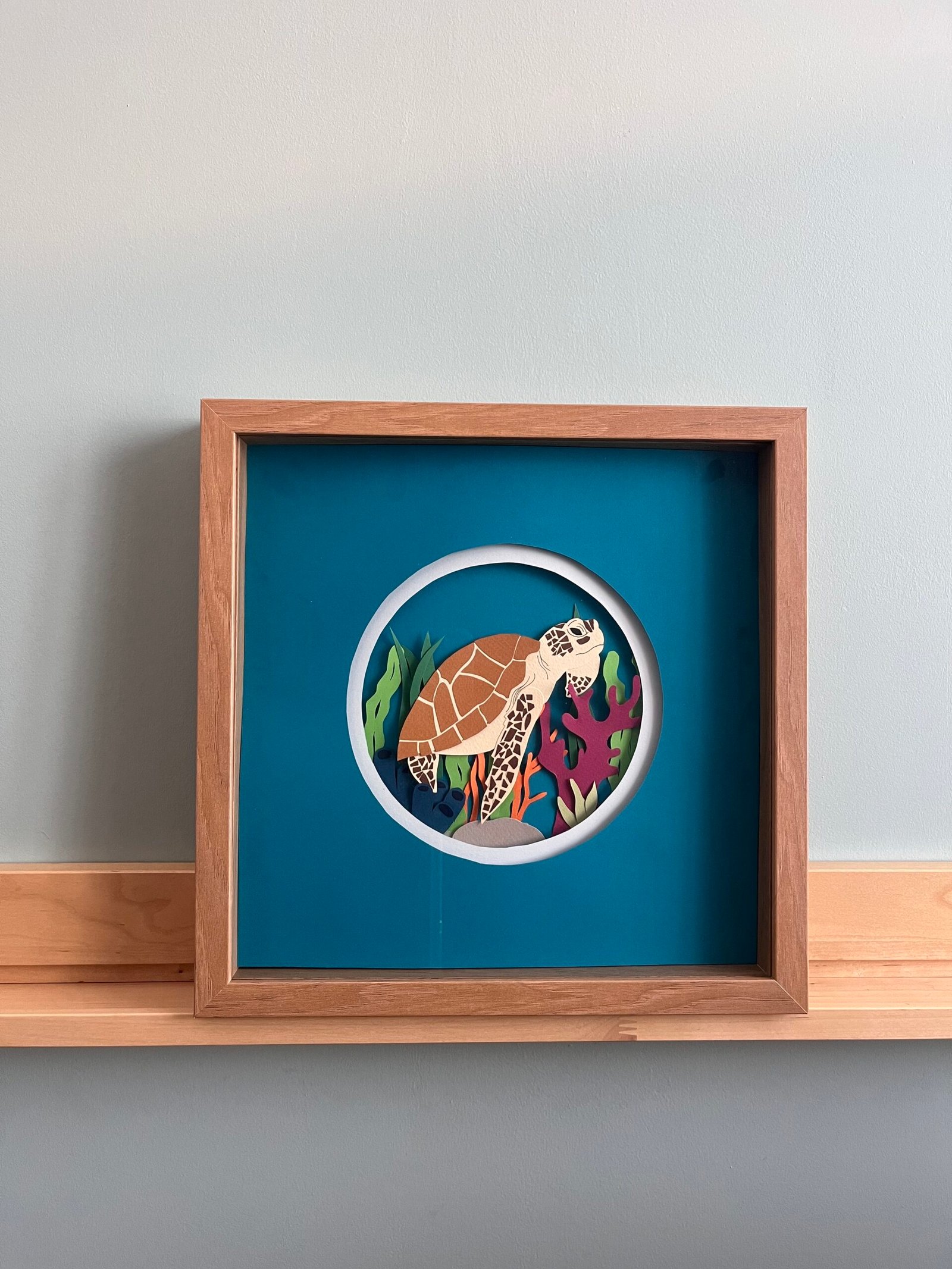 Série « Sous l’océan », entièrement réalisée à la main. Cadre en bois 30x30cm.